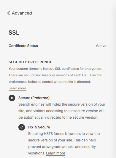 New Squarespace sites come with the SSL certificates enabled but if you need to double check you can easily do so by going to Settings>Advanced>SSL in the backend menu and checking that it’s active. Both ‘Secure’ and ‘HSTS Secure’ should be enabled.